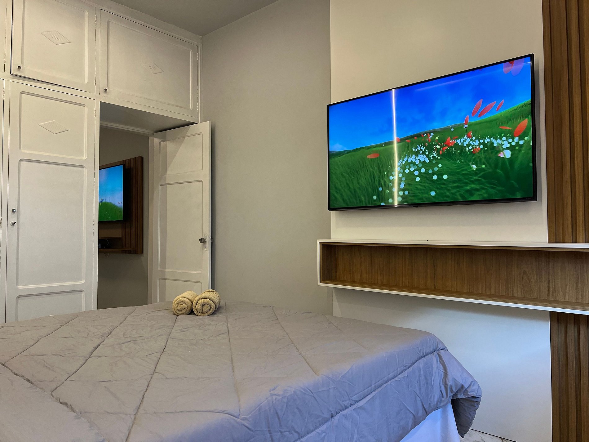 Apartamento recém reformado com ar-condicionado, tv smart e internet. Pertinho de tudo. Cama, ar-condicionado split e banheiro moderno para garantir seu conforto! Portaria 24 horas.