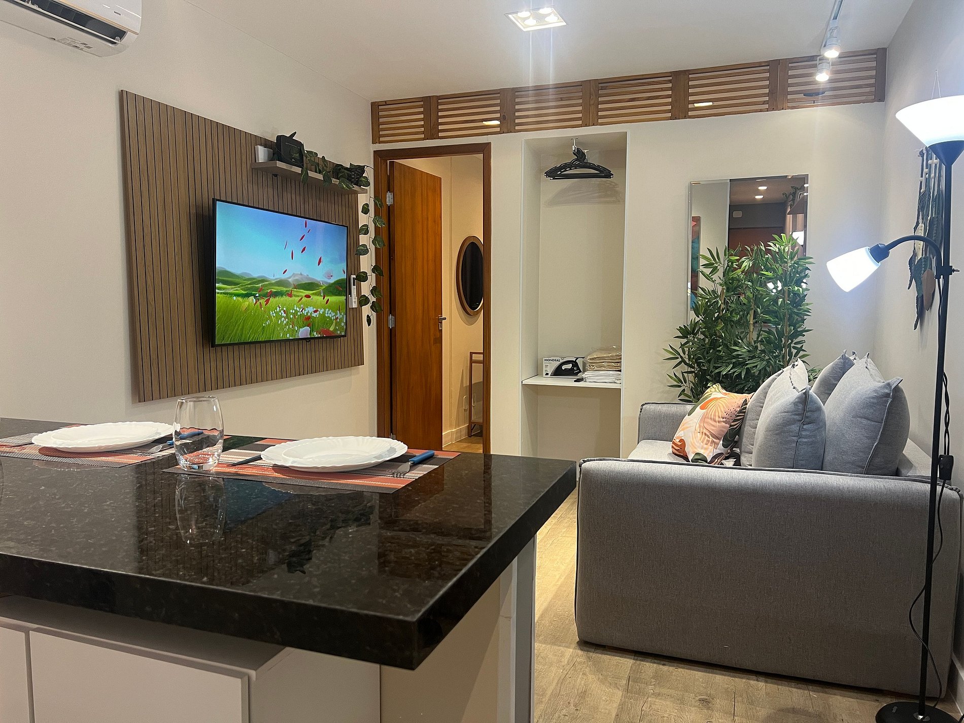 Apartamento confortável com portaria com acesso 24 horas, internet, ar condicionado na sala, quarto e cozinha equipada.